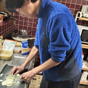 ここから課題料理を作るため、息子が登場。まずは玉ねぎを薄切りにします。