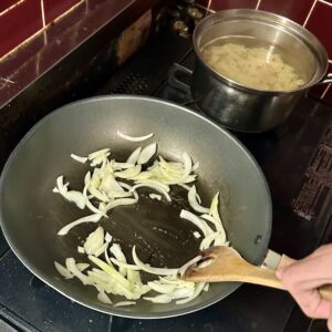 バターで玉ねぎ、厚切りベーコン、しめじを炒め、小麦粉を入れてよく炒めていきます。
