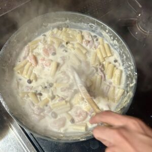 火を止めて、むき海老、茹でたマカロニをホワイトソースの中にいれて混ぜ合わせ、耐熱皿にいれ、ピザ用チーズをかける。