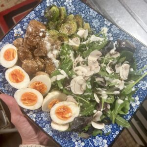チキンソテーに芽キャベツソテー、グリーンサラダ、スライスしたマッシュルーム、ゆで卵を添えたシーザーサラダにしました。