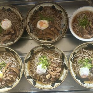 年越し蕎麦には甘く炊いた椎茸、揚げ、半熟卵、ネギをのせていただきました。