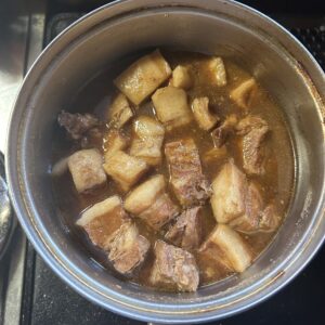 お正月用に豚の角煮を作っていきます。圧力鍋に豚バラ肉と長ネギの青い部分と生姜、酒を入れ、ひたひたになるくらいに水を入れて、ピンが上がったら20分かけていきます。