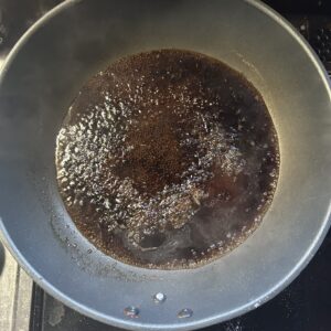 煮汁ごと鍋に移し、醤油大5、酒、みりん、甜菜糖を各大2を入れて10分くらい煮る。