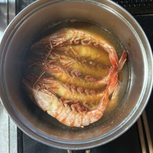 海老のうま煮は、鰹出汁に薄口醤油、酒、みりんを入れて炊いたもの。