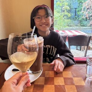 娘はアイスココア、私は白ワインをいただきました。カンパーイ!