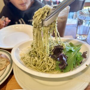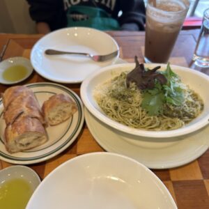 今日はフレッシュバジルのジェノベーゼパスタにしました。パスタにはバゲットも付いてきます。