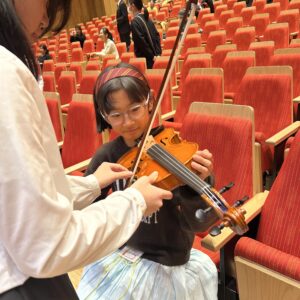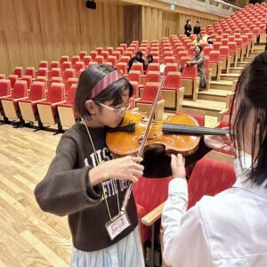 こちらはヴァイオリン。お友達が弾き方を教えてくれました。なかなか触れることのない楽器ばかりだったので、とってもいい体験になりました。