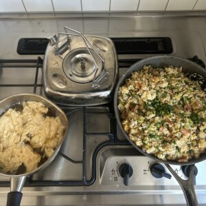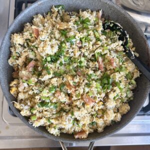 食べ終わった後は、息子の昼ごはんを準備しました。今日はしらすの炒飯。ベーコンも入れて、ネギ、炒りごまをたっぷりかけました。