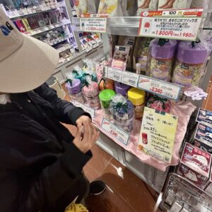 ヒカリエに来たら、必ず立ち寄るアメリカンファーマシー。クナイプの新しい香りをチェックする娘。