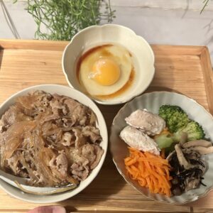 帰ってからすぐに夕飯の支度をしました。前日に作っておいた牛丼とサラダ盛り合わせで簡単に終了。
