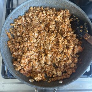 作り方>フライパンにオリーブオイルとにんにくを入れて、香りがしてきたら、豚ひき肉を入れて炒め、色が変わったら、みじん切りした玉ねぎ、にんじんを入れて炒める。調味料は、ケチャップ、スイートチリソース、醤油少々、チリパウダー、クミンパウダー、レモン汁を適当に。炒め合わせて、味を見て塩で調整。