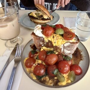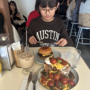 ほどなくメニューが運ばれてきました。私はフレッシュトマトとチーズのオープンサンド、娘はスマッシュチーズバーガー。