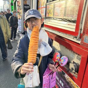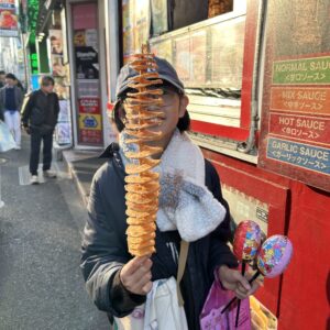 今回はスヌーピーなどのキャラクター狙いでしたので、厳選して購入したのですが、その後竹下通りを歩いていたら、次から次へとシール販売店を発見💦やっぱり見たら欲しくなり、お年玉と相談しながら、追加購入してました。食べ歩きしたい!ということで今回はロングポテトにしました。