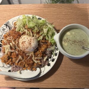このまま渋谷駅までぶらぶらし、レタスとピザチーズを購入して帰りました。帰ったらすぐにごはんを炊いて、タコライスを作りました。レタスを刻んで、タコミートと半熟卵を乗せて、ピザチーズ、チリパウダーをかけたら完成です。冷凍しておいたブロッコリーポタージュキューブを解凍し、豆乳を入れて温めて、スープを作りました。