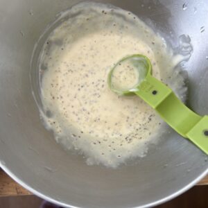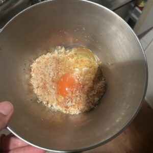 作り方>パン粉1/2カップ、豆乳大3、卵1個、を合わせてパン粉を湿らせる。