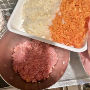 ボウルに牛豚合いびき肉700g、塩小1、ナツメグ少々を入れて粘りが出るまで手でよく混ぜ合わせ、先ほど湿らせたパン粉を加えてさらに混ぜる。ここにみじん切りした玉ねぎ1/2、にんじん1/2を入れて均等に混ざるまでよく混ぜ合わせる。