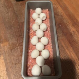 パウンド型(25×9×6を使用)にミートローフ生地半量を、底に空気を入れないように敷き詰める。うずらの卵15個を真ん中に並べる。