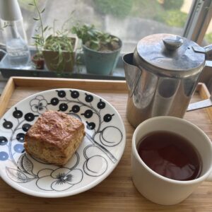 まだ仕込みも残っていたので、とりあえず手早く朝ごはんを済ませます。紅茶を淹れて、友人にもらったキャラメル生地のスコーンをいただきました。