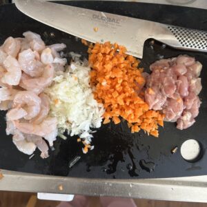 作り方>お米3合は洗ってザルにあげて水を切っておく。鶏もも肉150gは小さくキューブ状にカット、にんじん1/3本、たまねぎ1/2個はみじん切り、海老15尾は少し大きめに2〜3カットする。