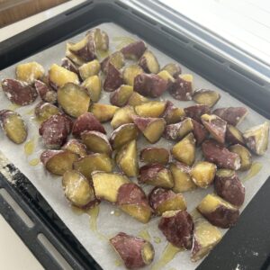 作り方>オーブンを200℃に予熱し、調理開始。さつまいもを洗ってひと口大にカットし、耐熱皿に平に並べてラップをし、電子レンジで10分程度加熱。軽く小麦粉をまぶしてオリーブオイルを回しかけて、20分〜25分こんがり焼き色がつくまで焼く。