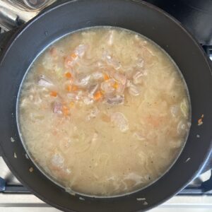 厚手の鍋(ルクルーゼなど)にバター1片、にんにくみじん1/2個を入れて中火にかける。香りがしていたら、鶏肉→野菜の順に炒め、お米を入れて軽く炒めたら、コンソメスープを3カップ弱、塩を軽く振り、全体的にまぜ、中火にかける。