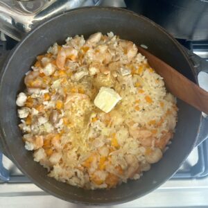 沸騰してきたら、蓋をし、弱火で13〜15分炊く。火元からおろし、蓋をしたまま10分ほど蒸らす。炊きあがったら全体を混ぜ合わせて、バターを1片入れて、余熱で溶かして混ぜる。