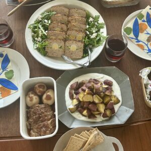 続いてウチに移動して、持ち寄りごはんをテーブルに並べていきます。私はミートローフをカットし、器に盛り合わせました。
