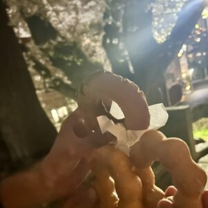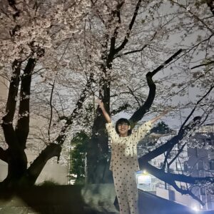 みんなを送りがてら、ミスドにドーナツを買いに行き、お風呂入った後に夜桜を見に桜見台へ。それぞれ好きな飲み物を持って、ドーナツで乾杯しました。